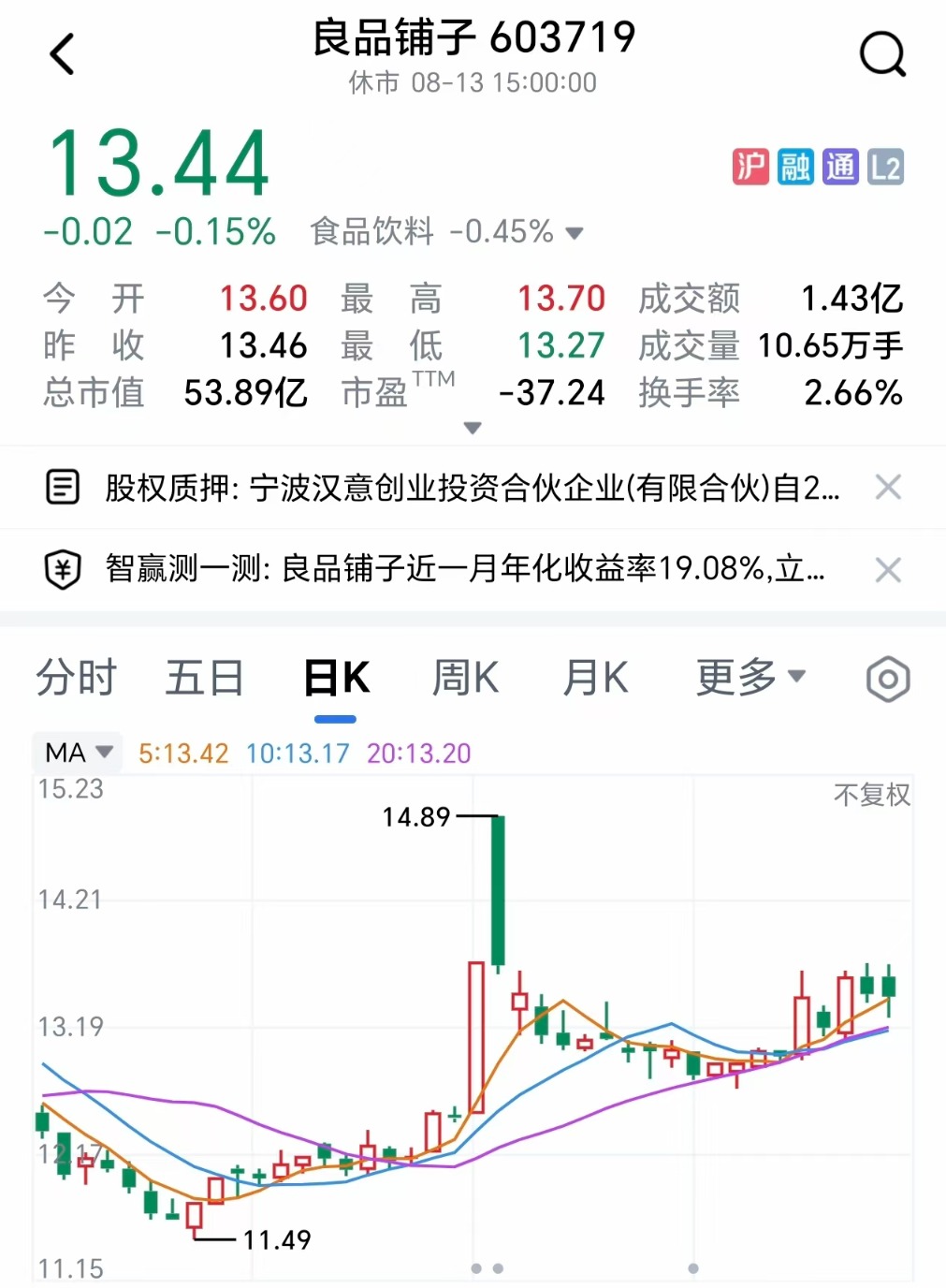 二级市场上,良品铺子8月13日收盘报13.44元/股,跌0.15%,最新市值约为53.89亿元,这一市值较之公司上市当年一度创下的超过340亿元的市值巅峰,已然蒸发84%!